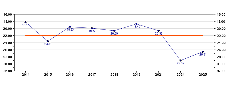 | Forrige tid | 26.34 (2025) |