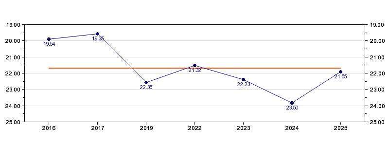 | Forrige tid | 21.55 (2025) |