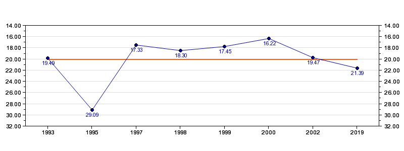 Antall deltagelser8 (i perioden 1993 - 2019)