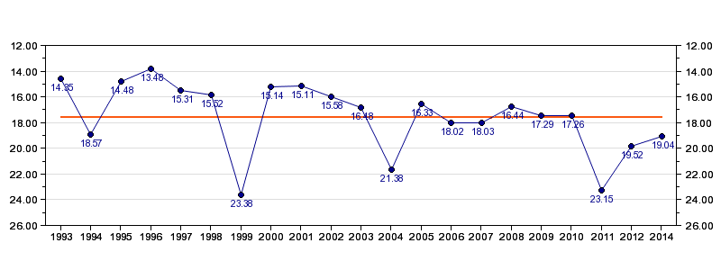 | Antall deltagelser | 21 (i perioden 1993 - 2014) |