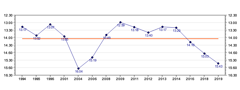 | Antall deltagelser | 15 (i perioden 1994 - 2019) |