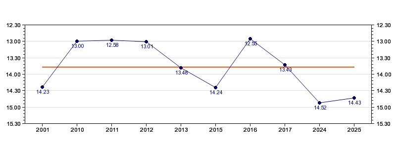 | Forrige tid | 14.43 (2025) |
