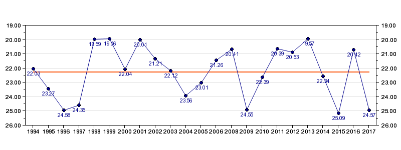 | Antall deltagelser | 23 (i perioden 1994 - 2017) |