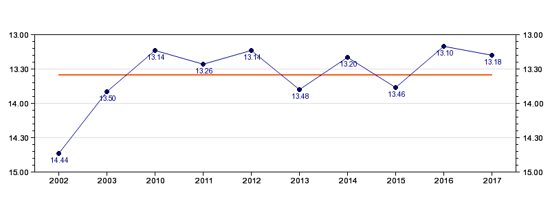 | Forrige tid | 13.18 (2017) |