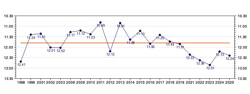 | 2025 | Kalkulator | 12:24 (1458 m/h) | 02:15 (1434 m/h, 98 %) | 06:02 (03:47, 1454 m/h, 99 %) | 11:03 (05:01, 1367 m/h, 93 %) | 12:24 (01:21, 1848 m/h, 126 %) |