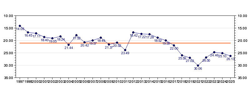 Antall deltagelser27 (i perioden 1997 - 2025)