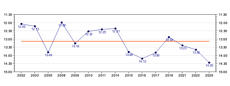 Antall deltagelser15 (i perioden 2002 - 2025)