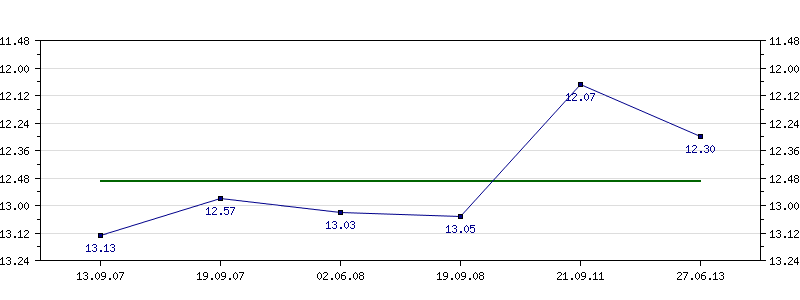 | 13.09.2007 | 13.13 | 19.09.2007 | 12.57 | 02.06.2008 | 13.03 | 19.09.2008 | 13.05 | 21.09.2011 | 12.07 | 27.06.2013 | 12.30 |