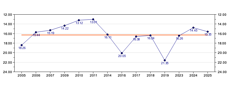 Antall deltagelser14 (i perioden 2005 - 2025)