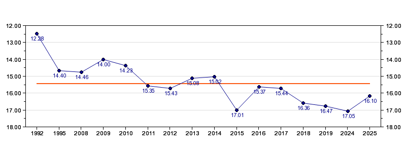 Antall deltagelser16 (i perioden 1992 - 2025)