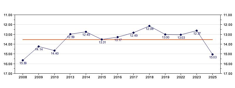 Antall deltagelser13 (i perioden 2008 - 2025)