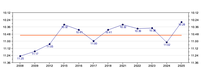| Forrige tid | 10.28 (2025) |
