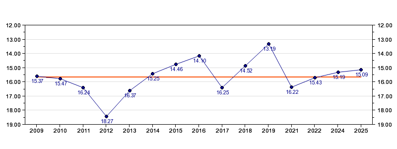 Antall deltagelser15 (i perioden 2009 - 2025)