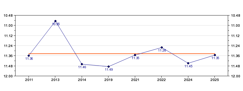 | Forrige tid | 11.35 (2025) |