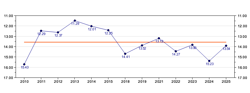 Antall deltagelser13 (i perioden 2010 - 2025)