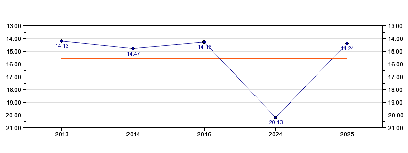 | Forrige tid | 14.24 (2025) |
