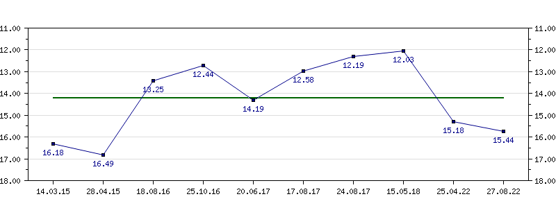 | 14.03.2015 | 16.18 | 28.04.2015 | 16.49 | 18.08.2016 | 13.25 | 25.10.2016 | 12.44 | 20.06.2017 | 14.19 | 17.08.2017 | 12.58 |